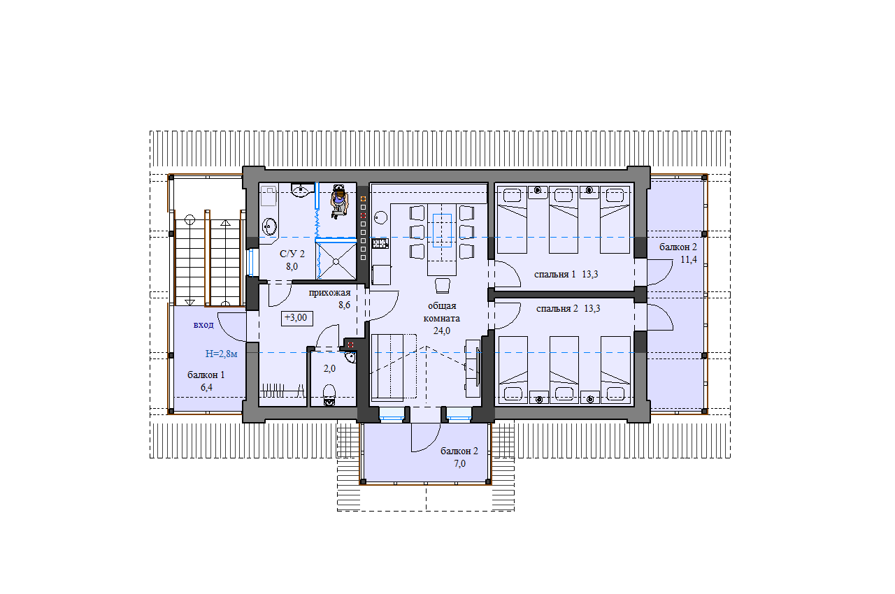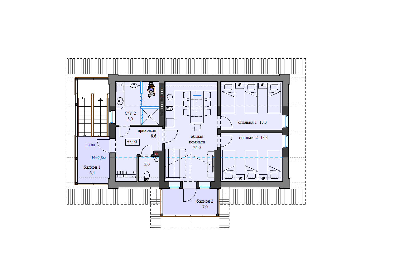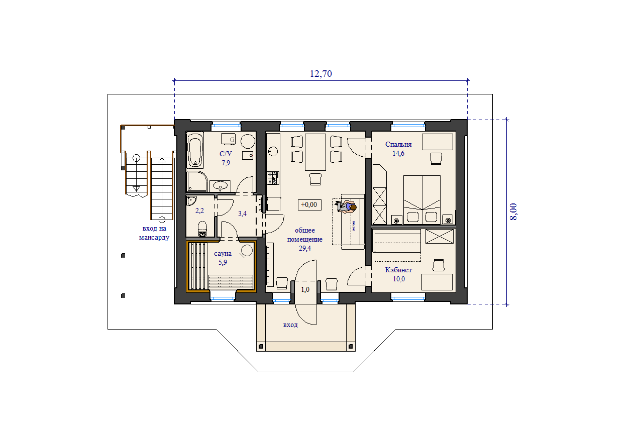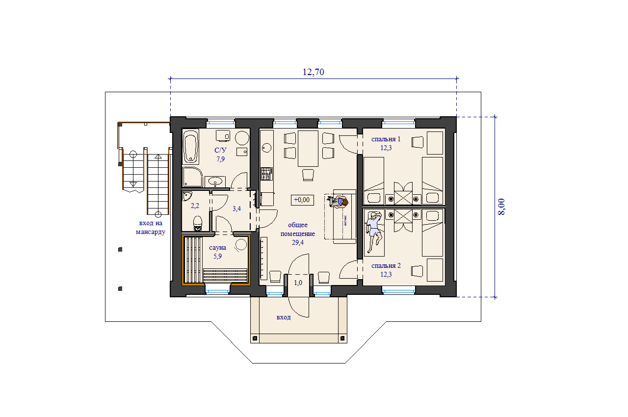 Габариты дома (капитальная часть) - 12,7 x 8,0м